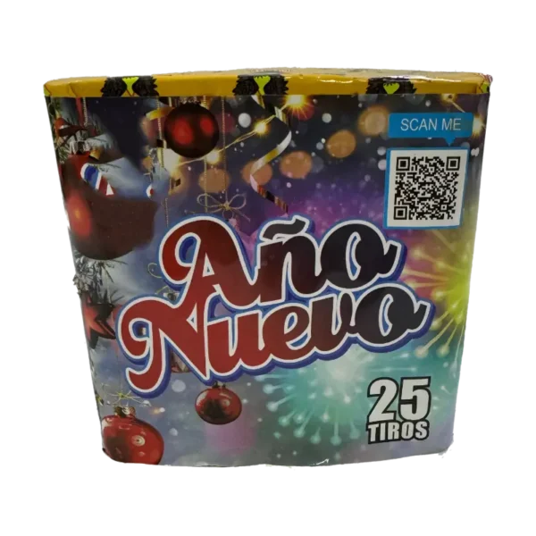 «Torta año nuevo de 25 tiros de cañón 0.8″, producto pirotécnico aéreo con efecto de pirotecnia con explosión multicolor marca magia y color.