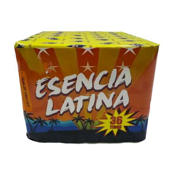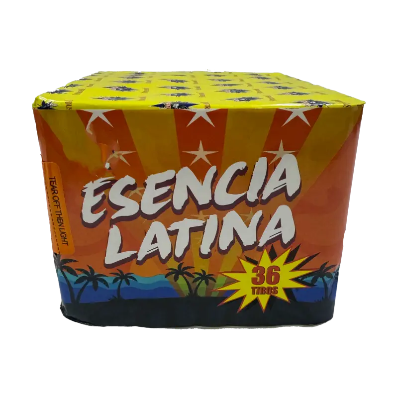 -Torta Esencia latina de 36 tiros de pirotecnia en abanico de varios colores y efectos.