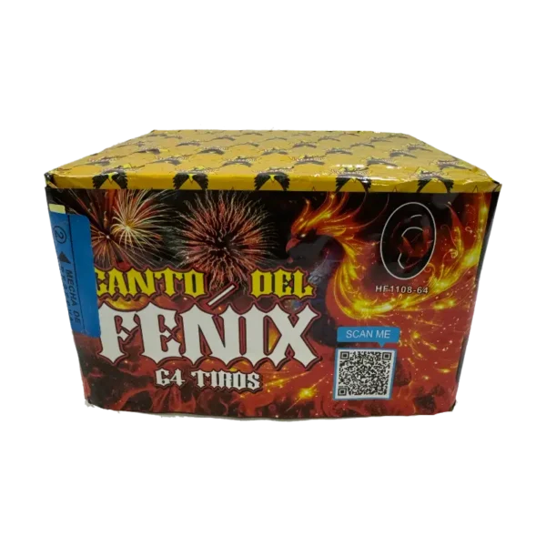 -Torta canto del fénix 64 tiros de pirotecnia en abanico de varios colores y efectos