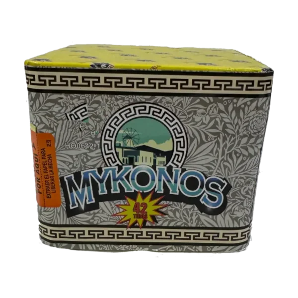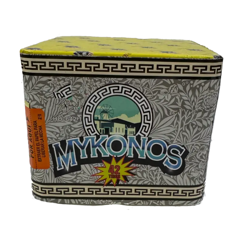 -Torta Mykonos 42 tiros de pirotecnia de varios colores y efectos.
