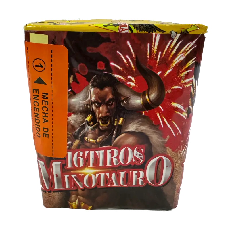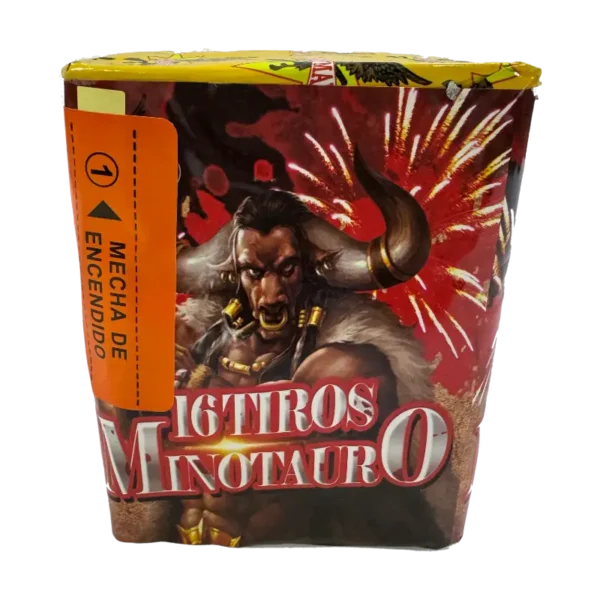 -Torta Minotauro de 16 tiros de pirotecnia de variados colores y efectos.