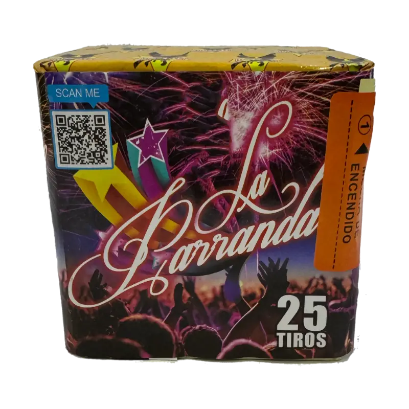 «Torta la parranda de 25 tiros de cañón 0.8″, producto pirotécnico aéreo con efecto de pirotecnia con explosión multicolor marca magia y color.