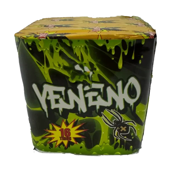 Torta Veneno de 16 tiros de cañón 0.8″, producto pirotécnico aéreo con efecto de pirotecnia con explosión multicolor, marca magia y color.
